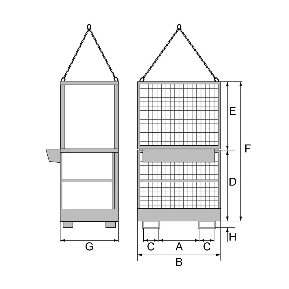 Die Kettenaufhängung ist im Lieferumfang enthalten. Durch die Einfahrtaschen ist diese Bühne auch mit Gabelstaplern ab 1500 kg Hubkraft nutzbar.