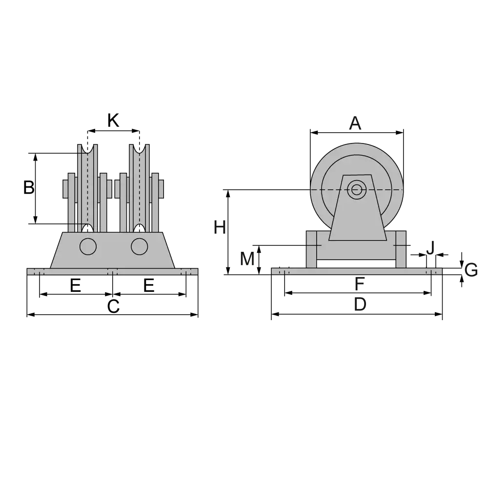 Artikel | Seilzugkraft *kg | für Seil Ø mm | Rolle A | B | C | D | E | F | G | H | J | K | M | Gewicht kg |
