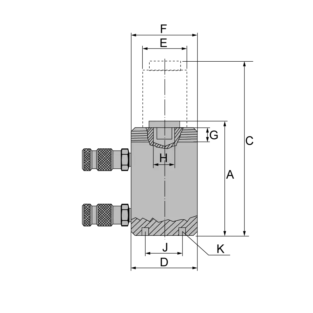 Artikel | Presskraft | Hub | A | C | D | E | G | J | F (UNC) | H (UNC) | K (UNC) | Kolbenfläche | Ölvolumen | Gewicht |