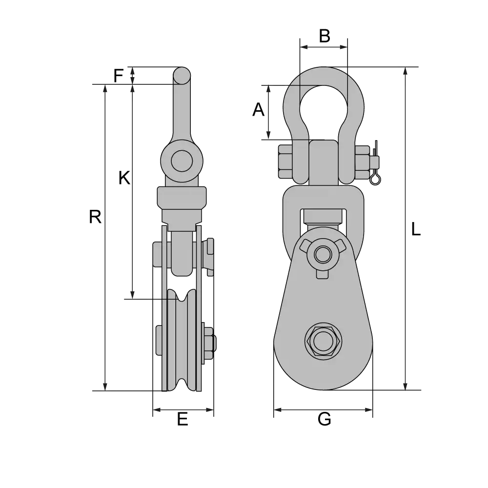 Artikel | Tragfähigkeit kg | Laufrollen Ø mm | für Seil Ø mm | A | B | E | F | G | K | L | R | Gewicht kg |