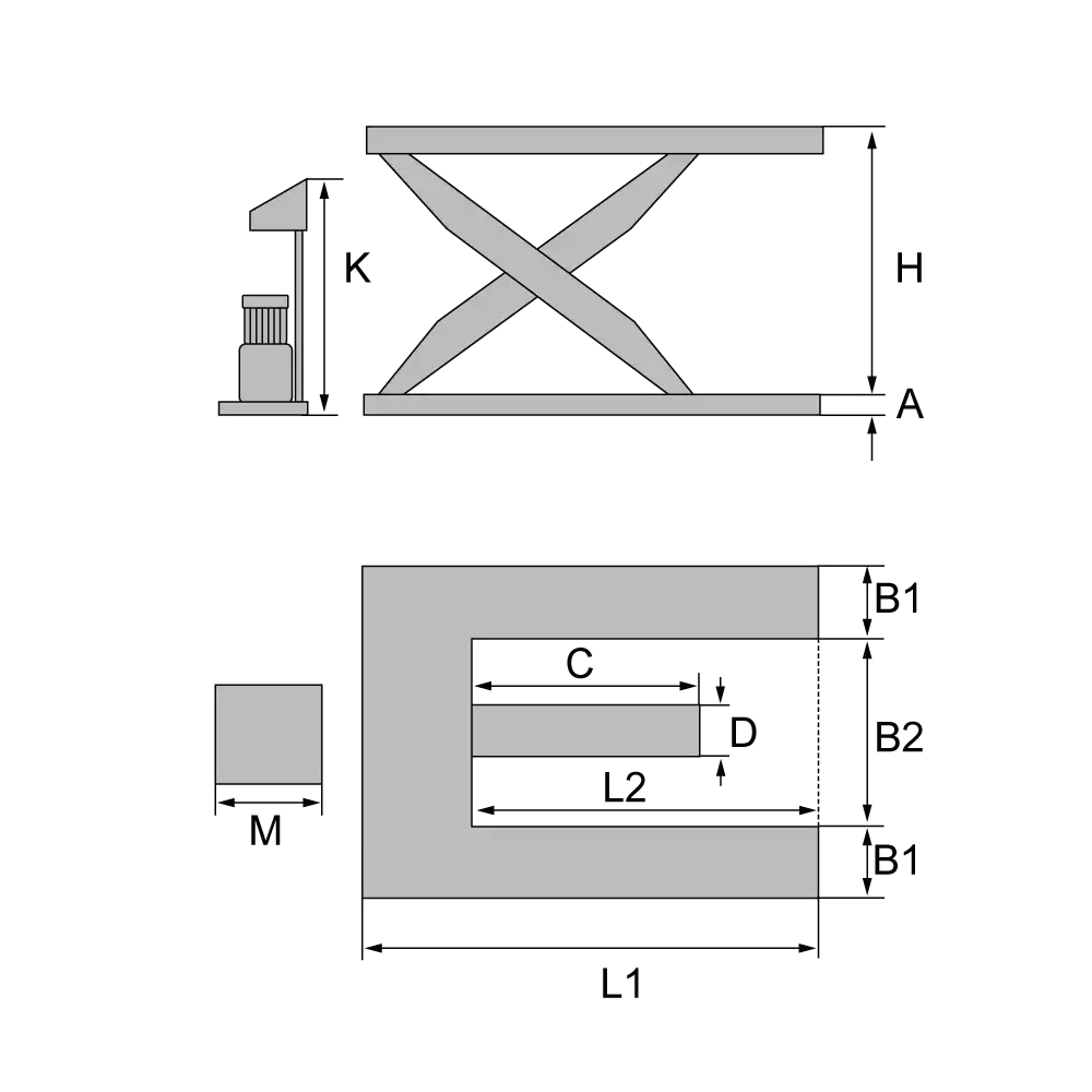 Artikel | Tragfähig- | Hub mm | A | B1 | B2 | C | D | K | L1 | L2 | M | Plattform (LxB) | Hubzeit sec. | Leistung kW | Gewicht |