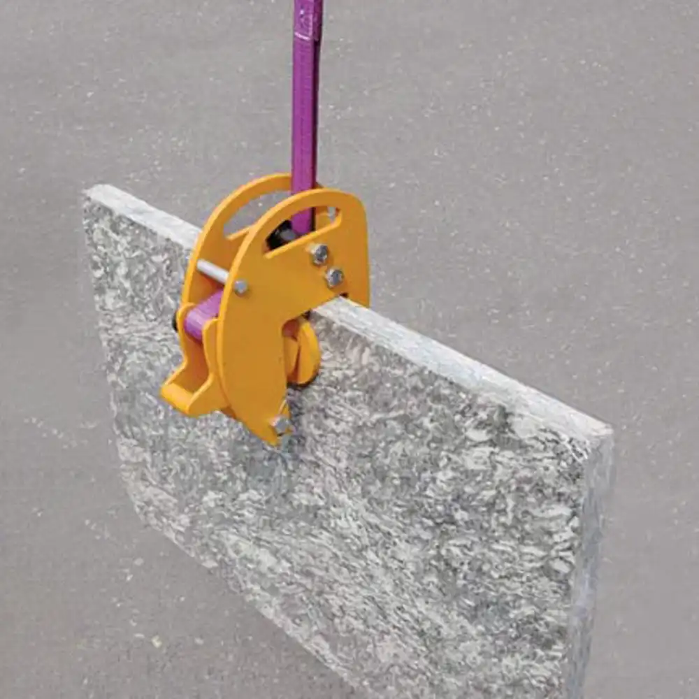 Durch die schmalen Backen wird das Umlegen stehender Platten oder das Aufrichten liegender Platten ermöglicht, außerdem geeignet für die Aufnahme von engstehenden Platten. Die Federvorspannung verhindert unbeabsichtigtes Abrutschen der Klemme. Als Aufhängung dient eine Gurtbandschlaufe.