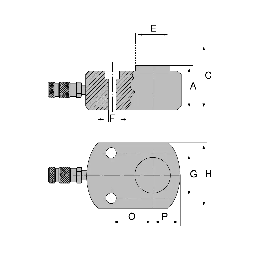 Artikel | Presskraft | Hub | A | C | E | F | G | H | O | P | Kolbenfläche | Ölvolumen | Gewicht |