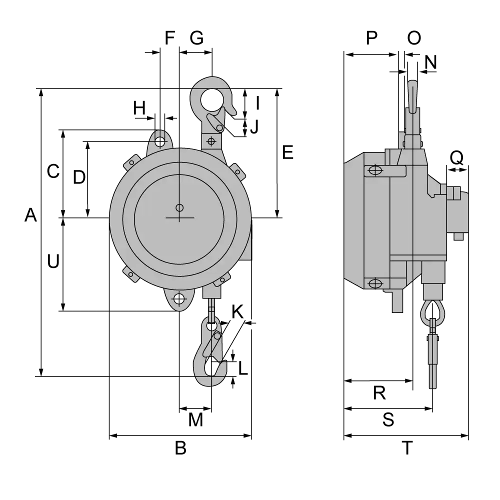 Artikel | Tragfähigkeit kg | A min | A max | B | C | D | E | F | G | H Ø | I | J | K | L Ø | M | N | O | P | Q | R | S | T | U | Gewicht kg |