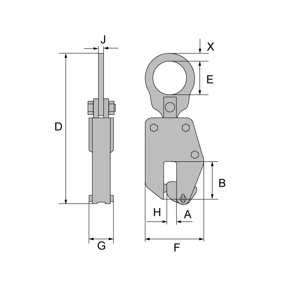 Artikel | Tragfähigkeit kg | Greifweite (A) | B | D | E | F | G | H | J | X | Gewicht kg |