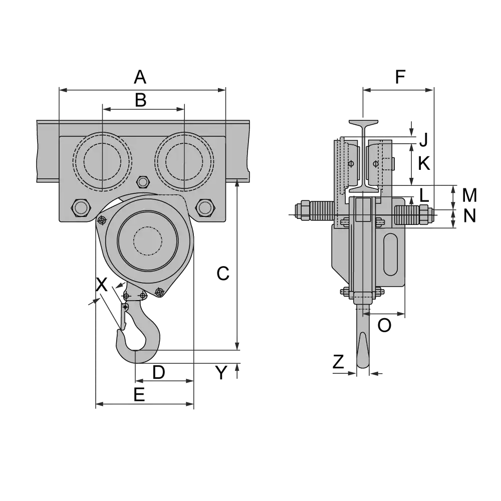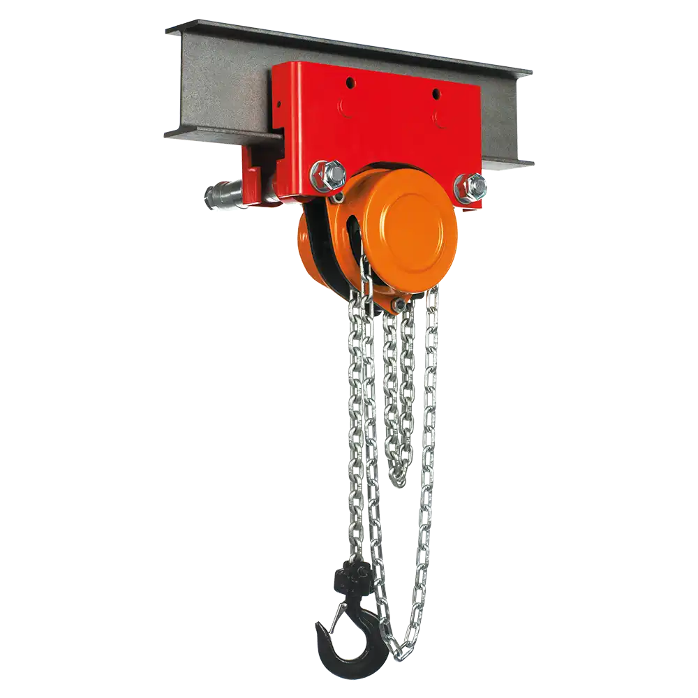 Artikel | Tragfähigkeit kg | Kettenstränge | Flanschbreite mm | kleinste Bauhöhe mm | Zugkraft max. daN | Handkettenabwicklung* m | Rollwiderstand daN | Gewicht** kg |