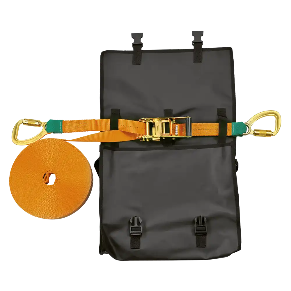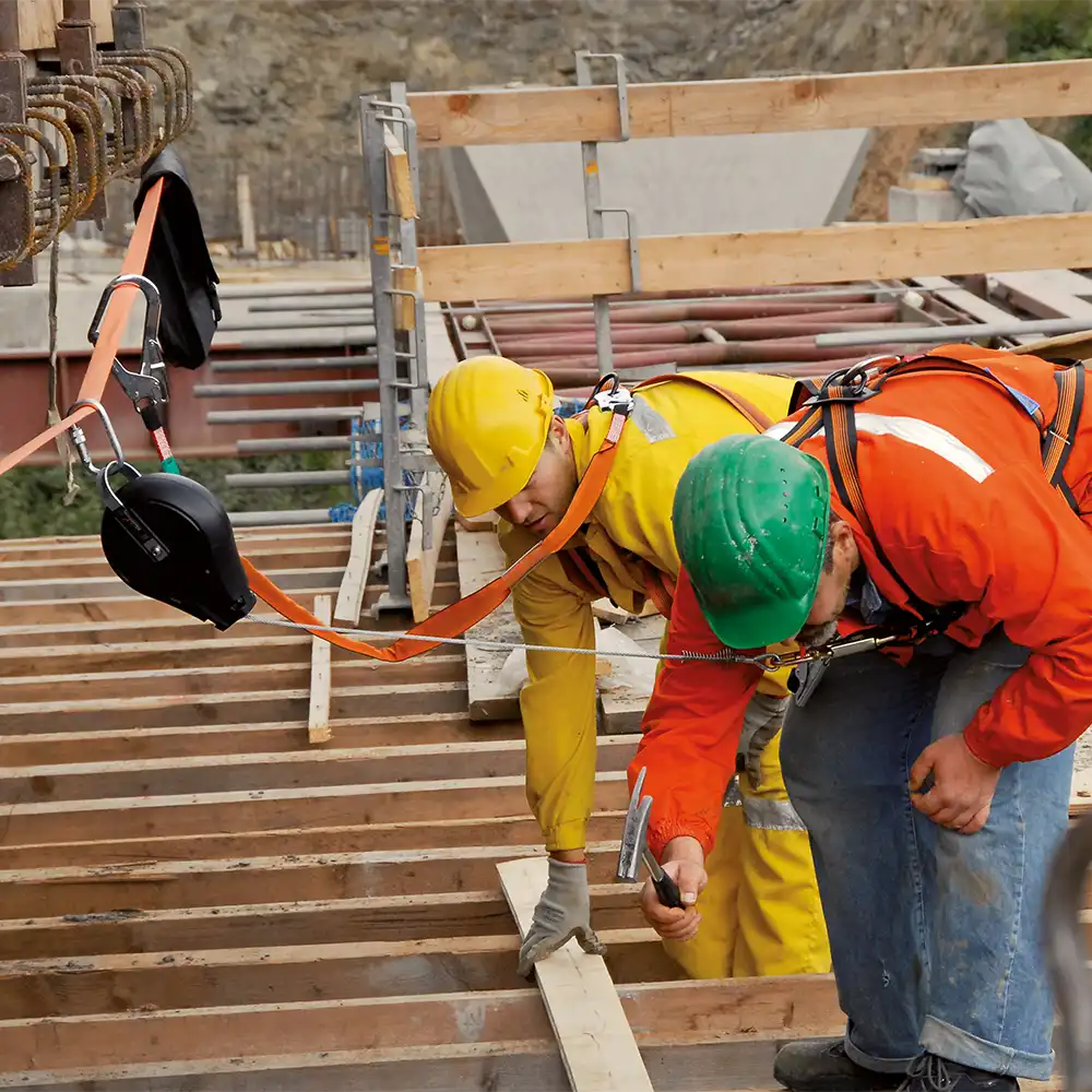 Transportables, schnell montierbares und flexibles horizontales Sicherungssystem mit modernster Ratsche für das Gurtband. Auf einer Strecke von 20 Metern können damit 2 Personen gesichert werden und sich jeweils in einem Feldabstand von 6 Metern frei bewegen.