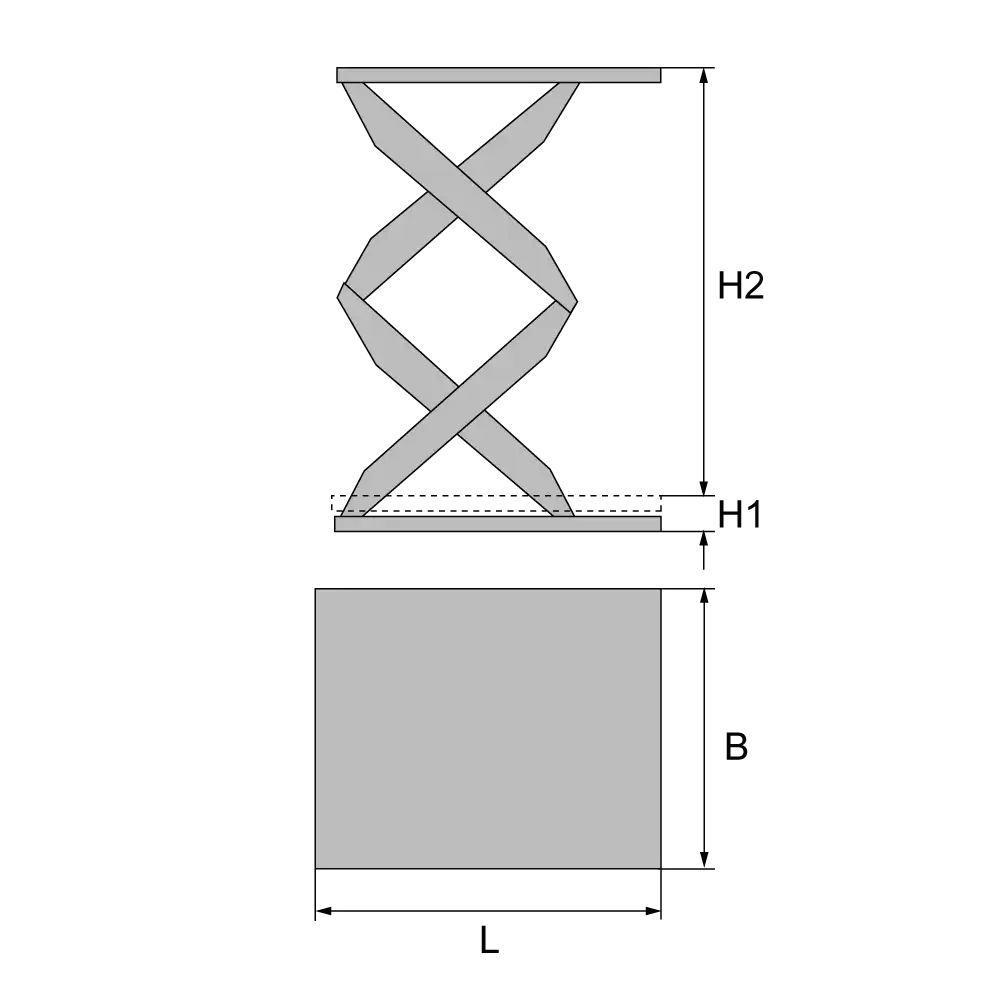 Artikel | Tragfähigkeit | Hub H2 | Bauhöhe H1 | Plattform LxB | Hubzeit | Motor | Gewicht |