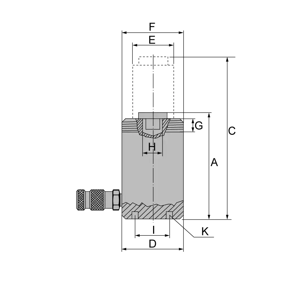 Artikel | Presskraft | Hub | A | C | D | E | G | I | F (UNC) | H (UNC) | K (UNC) | Kolbenfläche | Ölvolumen | Gewicht |