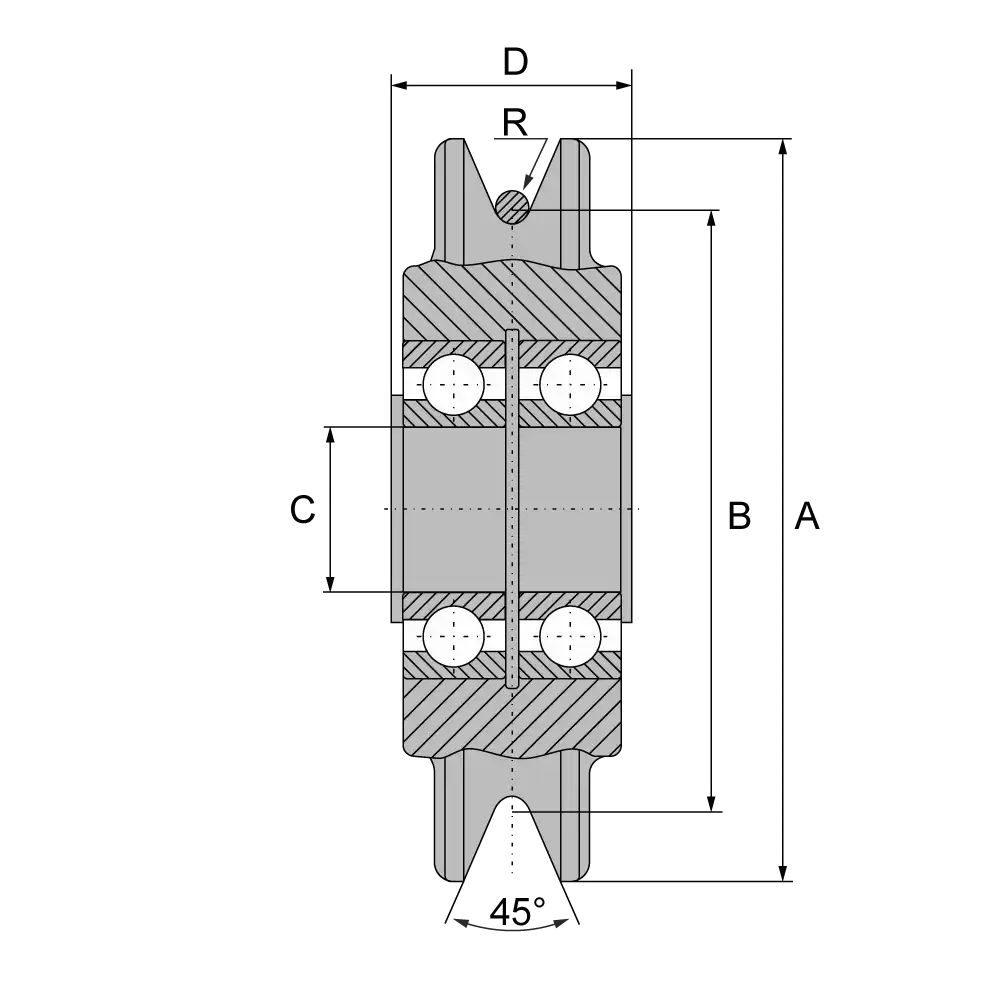 Artikel | Seilzugkraft 90° kg | Seilzugkraft 180° kg | für Seil Ø mm | Triebwerk- gruppe | Rolle A | B | C | D | R |