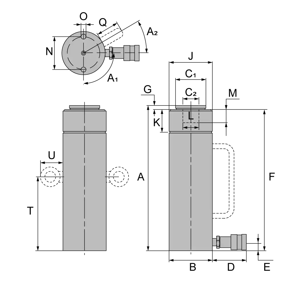 Artikel | Presskraft | Hub | A | A1 | A2 | B | C1 | C2 | D | E | F | G | J | K | L | M | N | O | Q | T | U | Kolbenfläche | Ölvolumen | Gewicht |
