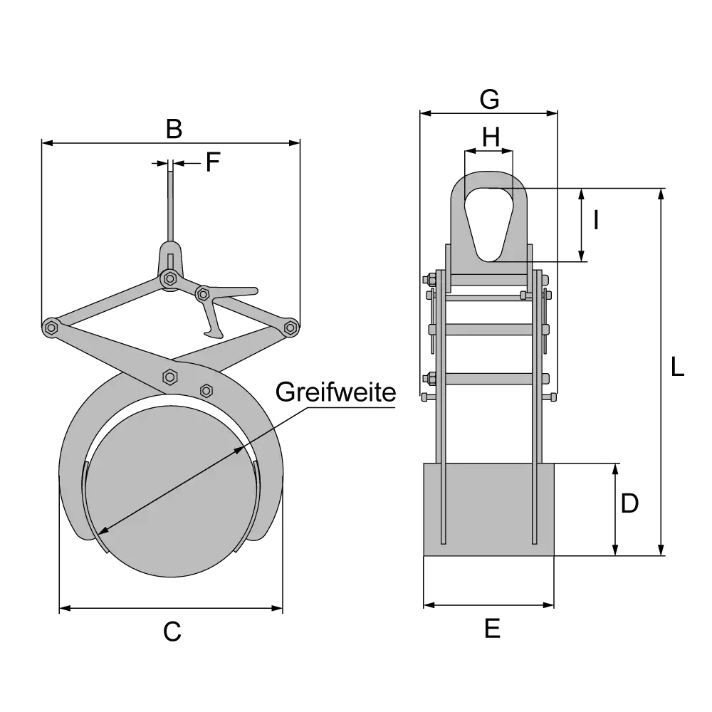 Artikel | Tragfähigkeit kg | Greifweite | B | C | D | E | F | G | H | I | L | Gewicht kg |