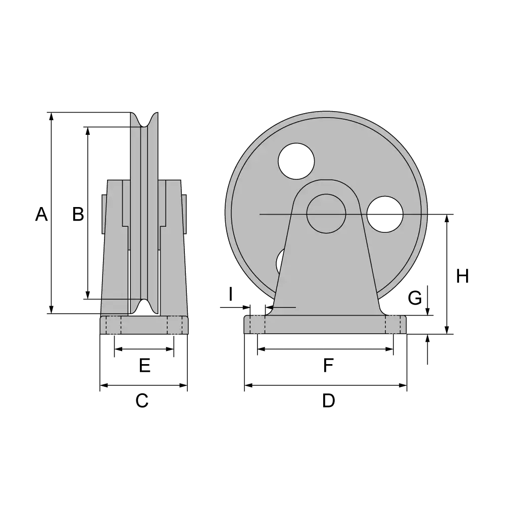 Artikel | Seilzugkraft *kg | für Seil Ø mm | Rolle A | B | C | D | E | F | G | H | I | Gewicht kg |