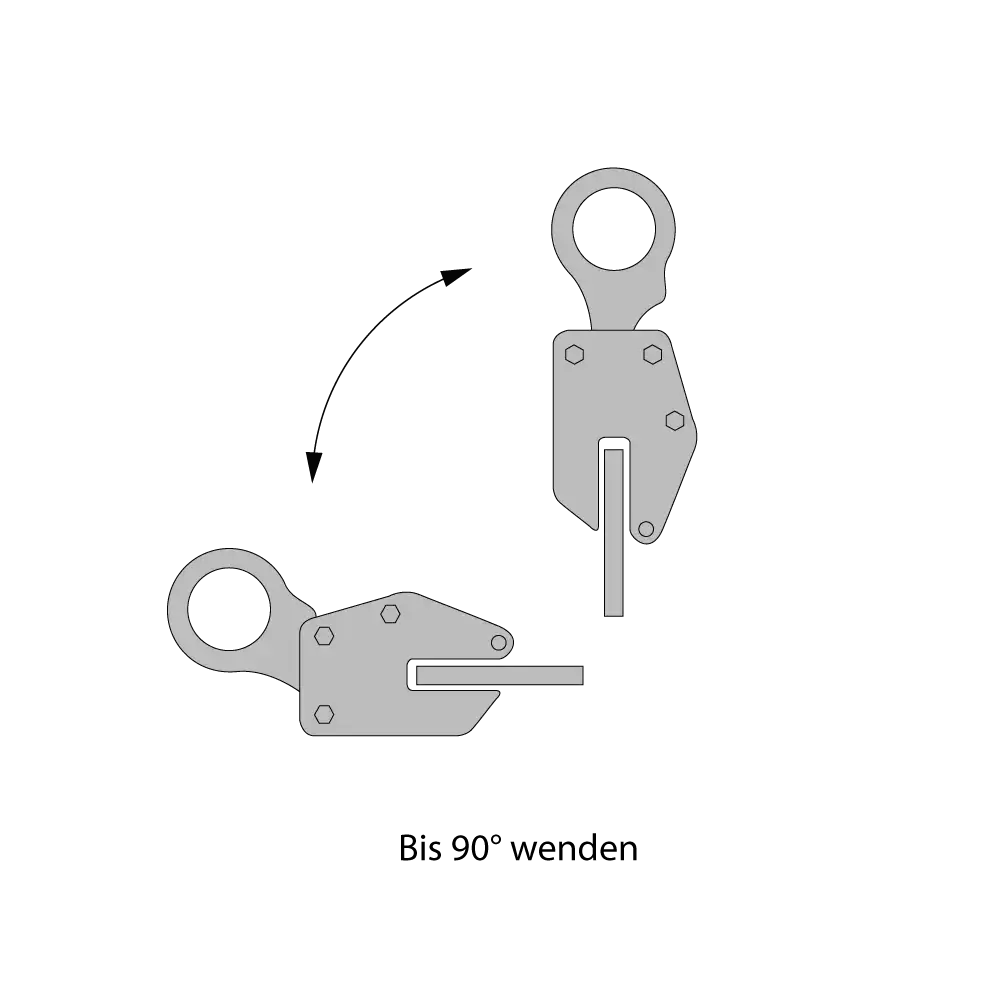 Der Greifbereich wird über eine Stellschraube vorjustiert. Für den senkrechten Transport, wobei die Last auch waagrecht aufgenommen und abgelegt werden kann.