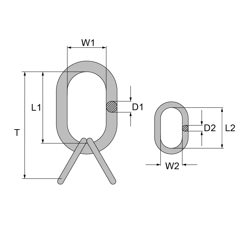 Artikel | für Kette 3-4 Str. mm | Tragfähigkeit kg | D1 | L1 | W1 | D2 | L2 | W2 | T2 | Gewicht kg |