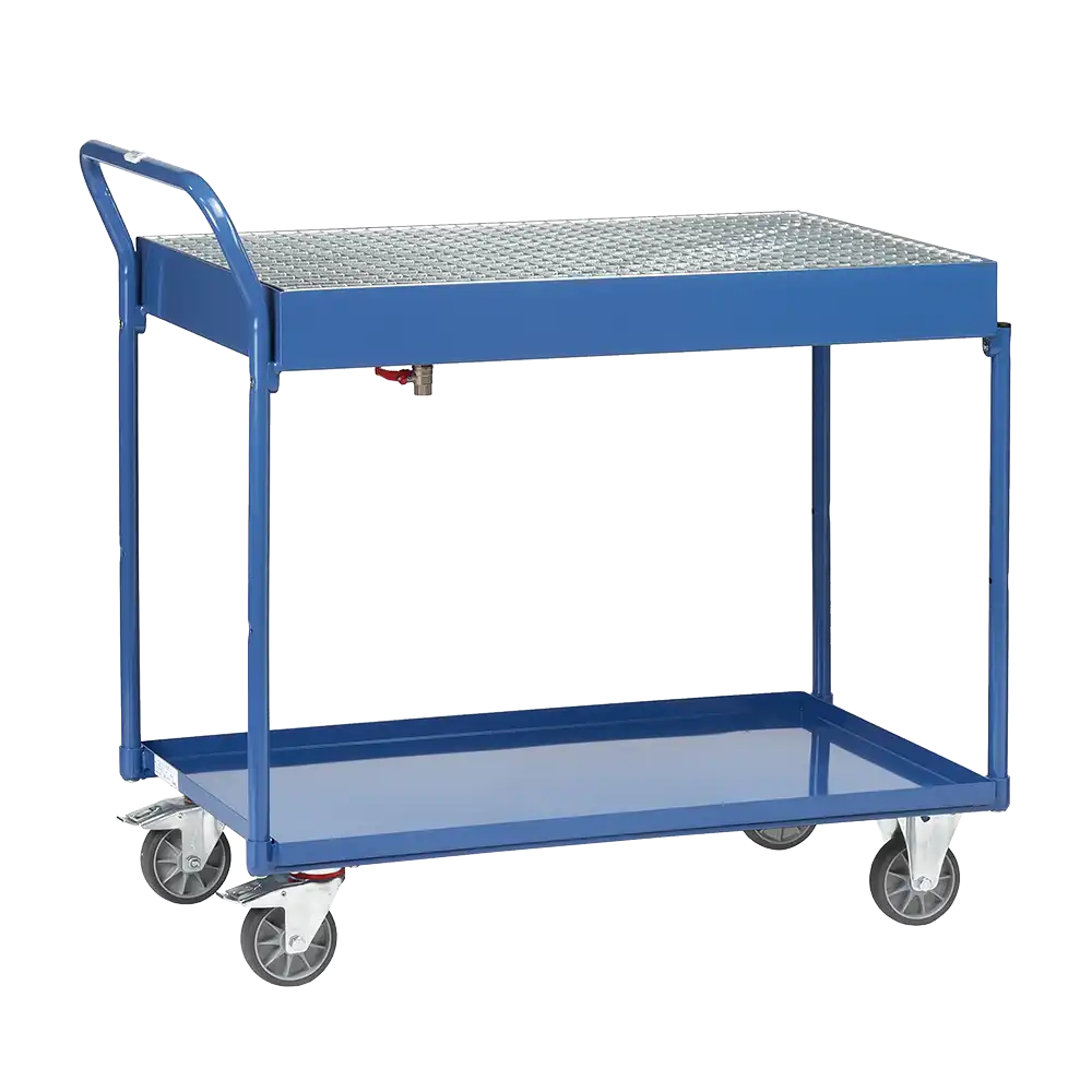 Der Boden der oberen öldichten Stahlblechwanne besitzt einen konischen Ablauf und einen 1/2"- Ablasshahn. Auf der Wanne ist ein Gitterrost mit einer Maschenweite von 31x31mm bündig lose eingelegt. Die Höhe der oberen Stahlblechwanne beträgt 100mm und die Höhe der unteren Wanne 25mm.