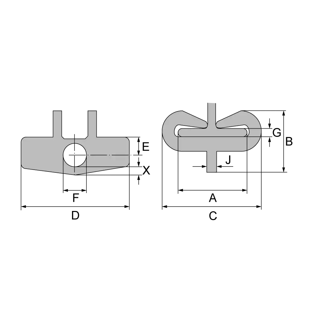 Artikel | Tragfähigkeit kg | Flansch | B | C | D | E | F | G | J | X | Gewicht kg |