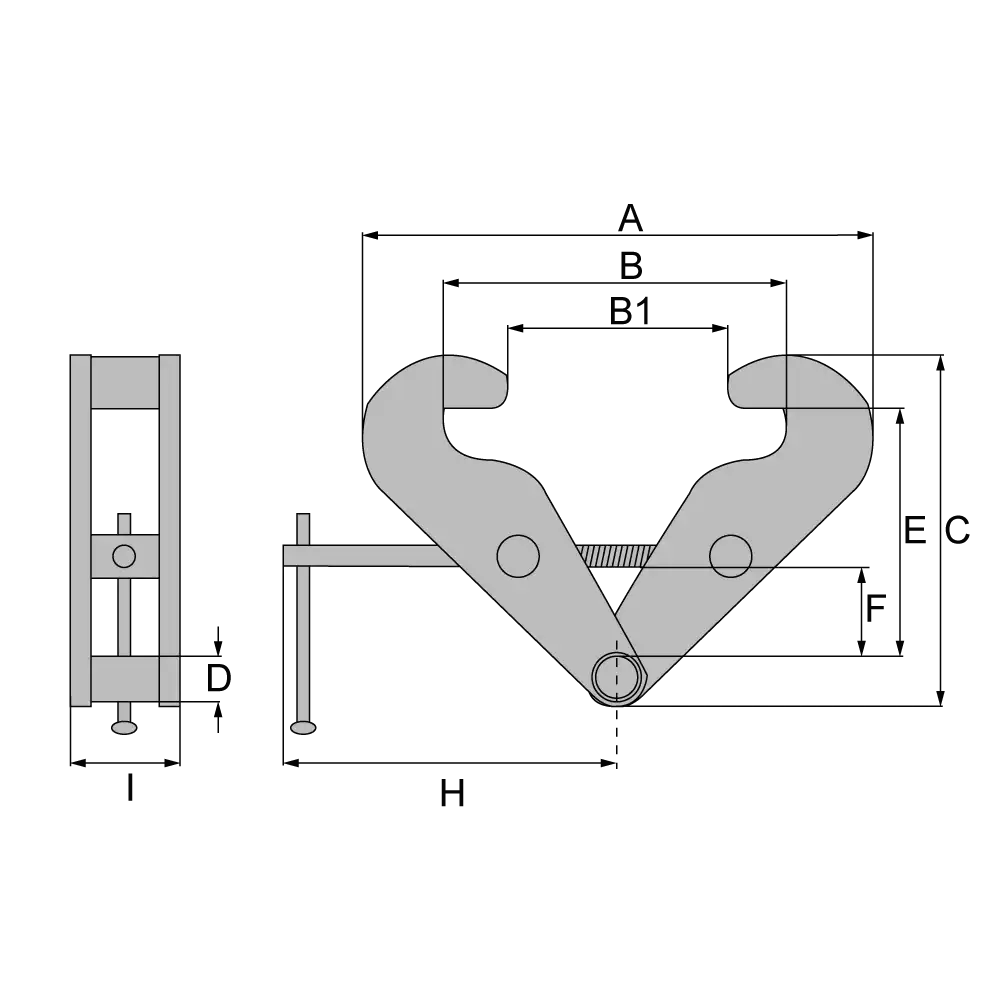 Artikel | Tragfähigkeit kg | Flansch | A max | B1 max | C min | D | E min | F min | H | I | Gewicht kg |