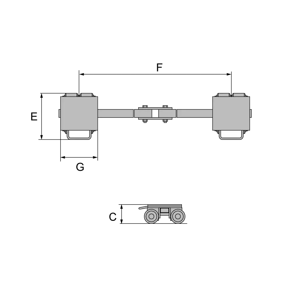 Artikel | Tragfähigkeit* kg | Lastrollen Stk. | Ø Rollen | Länge Lenk-/Verbindungsstange | A | B | C | D | E | F | G | Gewicht kg |