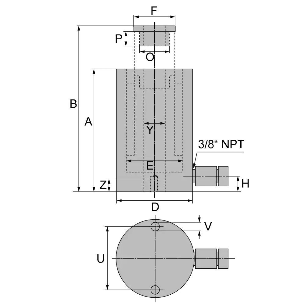 Artikel | Presskraft | Presskraft | Hub | A | B | D | E | F | H | O | P | U | V | Y | Z | Kolbenfläche | Ölvolumen | Gewicht |